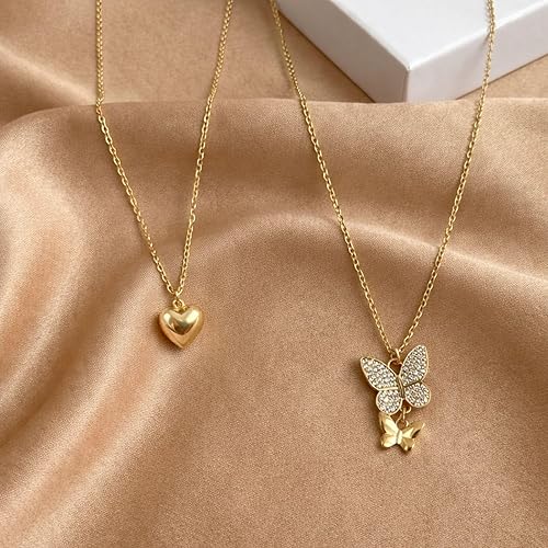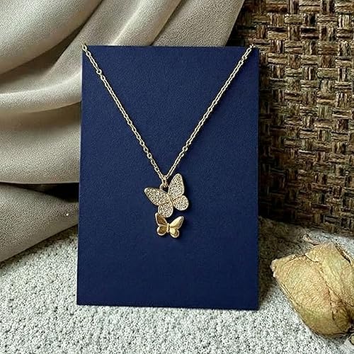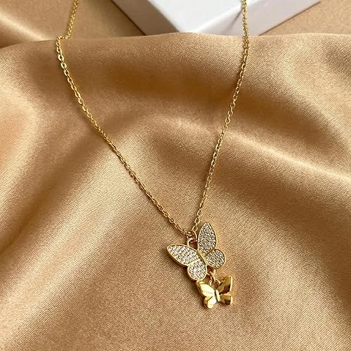 one tier is covered in crystals and the other is a smaller solid gold butterfly that hangs down. The upper butterfly is covered in high-quality cubic zirconia stones that add a touch of luxury to your look.