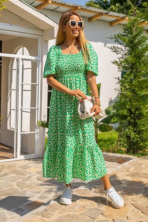 Women’s Casual Flower Print Puff Sleeves Maxi Dress